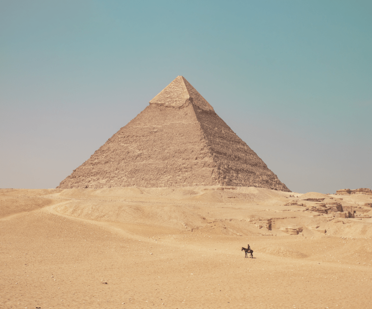 A shot of the Pyramid of Giza with a horse-rider in the foreground showing the scale of the landmark